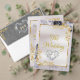 This elegant wedding announcement features a white satin center on a black and white marble background, framed with gold roses and leaves, embellished with a silver scroll heart. Designed to coordinate with the "Elegant Marble, Gold Leaves Frame & Scroll Heart" Wedding Collection. To change details, click «Personalize». To move the text or change the text size, font, or color click «Click to customize further»