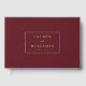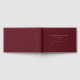This elegant wedding guest book features a sophisticated design with a deep maroon background and gold text, creating a luxurious contrast. The layout is minimalist yet refined, showcasing the names and date in a balanced, symmetrical arrangement using serif and cursive fonts for a touch of formality. Ideal for capturing well-wishes at a special occasion, this guest book combines classic style with modern simplicity, making it perfect for weddings or formal events. Its timeless aesthetic ensures it will be cherished as a keepsake long after the celebration.