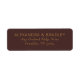 This elegant label features a minimalist design with a rich maroon background and gold-colored text, creating a sophisticated and timeless look. The layout is vertically oriented, with clean lines and precise typography that emphasize clarity and balance. Perfect for formal occasions, the classic serif font conveys formality and luxury, making it ideal for personalized stationery or invitations. The absence of decorative elements ensures that the focus remains on the essential information, offering an understated yet refined aesthetic.