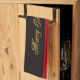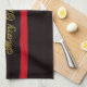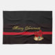 Wunderschönes Weihnachtshandtuch mit goldenem Frohen Weihnachtstext mit grünen Highlights auf schwarzem Hintergrund. Ein Imitat rotes Band mit goldenen Glocken und einem roten Bogen durchzieht das Design. Sehr elegantes Weihnachtsdesign für Ihre Urlaubsartikel.