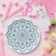 Teller aus runden Papieren im indischen Mandaladesign in Weiß- und Metallic-Blau. Unser schönes Mandala Design ist ideal für viele Veranstaltungen, von Hochzeiten über Geburtstage bis hin zu Duschen und Jubiläen.