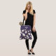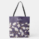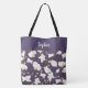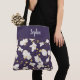 Elegante Tasche mit einem zarten goldenen Orchideenmuster auf lila Hintergrund. Das Band am oberen Teil der Tasche kann durch Hinzufügen Ihres Namens (oder eines anderen Textes) in einem Schriftart mit weißer Kalligraphie angepasst werden.