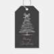 A sleek black gift tag featuring a sketched white ribbon Christmas tree topped with a bow and a custom message below. The clean monochrome look brings a modern twist to classic holiday packaging — simple, chic, and easy to personalize for friends, clients, or family gifts. Works beautifully for neutral or minimalist Christmas themes.