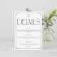 Share all the essential wedding reception and accommodation details with your guests using this elegant and modern enclosure card. Featuring a sophisticated minimalist design with a black and white color scheme, this card adds a touch of class to your wedding stationery suite. The top showcases a chic monogram with the initials 'G|M', followed by a bold 'DETAILS' title. The body of the card clearly outlines reception information and accommodation details, including a hotel name, address, and a reference number for a discounted rate. A dedicated section for 'MORE DETAILS' directs guests to your wedding website for additional information. This minimalist enclosure card is perfect for couples seeking a refined and understated aesthetic for their special day.