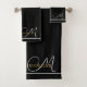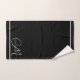 Personalisiert elegant, minimalistisch, Monogramm mit dem weißen Initial in einem anmutigen Drehbuch Schriftart, Goldname Badetuch Set Goldrahmen. Die Badezimmer sind mit einem minimalistischen typografischen Stil dekoriert.