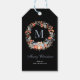A timeless holiday gift tag featuring an elegant watercolor Christmas wreath in soft dusty blue, red, and peach, delicately framing a personalized monogram in modern typography.