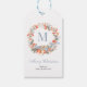 A timeless holiday gift tag featuring an elegant watercolor Christmas wreath in soft dusty blue, red, and peach, delicately framing a personalized monogram in modern typography.