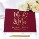 Elegantes bordeauxrotes Gästebuch mit "Mr. & Mrs." in einem großen Drehbuch, eine Darstellung von zwei Herzen romantisch verbunden, und Ihre Vornamen und Hochzeitstag, alles in Ihrer Wahl von echter Gold, Silber oder Rose Goldfolie gerendert. Sie können Ihren Titel auf der Wirbelsäule personalisieren und Ihr Lieblings-Verlobung-Foto auf der Rückseite hinzufügen.