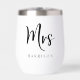 Eleganter personalisierter Thermalweintumbler für eine Braut oder Ehefrau zum Feiern ihrer Hochzeit oder ihres verheirateten Lebens mit "Mrs." in einem großen chic Drehbuch und Ihrem Familiennamen in klassischer Serifentypografie. Ein passender "Mr." Wäscher ist verfügbar - schreiben Sie uns für den Link.