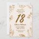 Ein elegantes Einladungs-Kartendesign zum 18. Geburtstag. Der Hintergrund ist in einem warmen Beige gehalten, die Dekoration ist elegant, Blume, Schmetterlinge und in feinen goldenen Linien illustrierte Pflanze sind sehr schön.