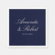 Minimalist personalized wedding napkins featuring elegant calligraphy names in navy blue and cream color design.