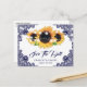 Elegant navy blue and sunflower wedding save the date postcard featuring sunflower flowers, delicate floral lace and string lights. Our navy blue rustic wedding save the date postcard is perfect for a rustic country, or barn wedding party inspired by sunflower flowers.