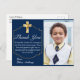 Vielen Dank an Ihre Freunde und Liebsten, die zu der First Holy Communion Ihres Sohnes gekommen sind oder großzügig ein Geschenk mit diesem eleganten goldenen Kreuz und burgundischen First Holy Communion Dankeschön Postcard. Diese Community Dankeschön-Karte zeigt ein schönes goldenes Kreuz in einem goldenen Rahmen vor einem einfachen marineblauen Hintergrund. Ersetzen Sie das Foto durch ein Bild Ihres Kindes, das auf der rechten Seite der heiligen Kommunion angezeigt wird, danke Ihnen postcard.