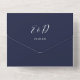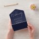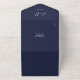 Alles in einer Hochzeitseinladung mit eleganter Typografie auf marineblau-blauem Hintergrund. Die Einladung enthält eine perforierte RSVP-Karte mit QR-Code. Entwickelt von Thisisnotme©