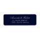 Navy blue wedding return address labels featuring elegant old money aesthetic typography.