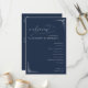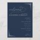 This elegant wedding program features a sophisticated navy blue background with white text, creating a striking contrast. The layout is clean and modern, with a mix of cursive and serif fonts that add a touch of formality and charm. Decorative geometric shapes in the corners enhance the minimalist design, while the structured schedule lists guide guests through the ceremony seamlessly. Perfect for couples seeking a refined and contemporary aesthetic, this program captures the essence of celebration and unity.