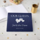 Elegant Navy with Hearts Guest Book designed with floating White Hearts on a Navy background for your Wedding Reception Accessories. The text includes: OUR GUESTS, The Bride and Groom's Names and Wedding Date. To personalize, simply insert your text into our easy template, replacing the sample.