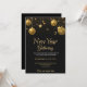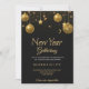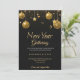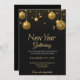 Elegant New Year invitation card featuring gold ornaments hanging against a black background. Details reveal event on December 31 at 7 PM.