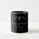 Eleganter Nurse Abschluss Caduceus Black Monogram Zwei-Tone-Kaffee-Tasse hat ein modernes Design und einen anpassbaren schwarzen Hintergrund, weiße medizinische Kadukus-Symbol und "Klasse der" maßgeschneiderten Jahr gebogen über das Symbol. Der Text ist "Krankenschwester Abschluss" in weißen trendigen handgeschriebenen Schrift. Personalisiert mit Name und Uni. Der Hintergrund kann in eine beliebige Farbe geändert werden.