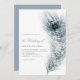 Elegant Peacock Feather Aquamarin Blue Script Wedding. Eine wunderschöne Pfauenfeder in Blau- und aquamarinen Tönen verläuft auf der rechten Seite und die Wörter sind auf das links abgestimmt. Einfach den Text personalisieren. Ein koordinierendes staubiges Blau ist auf der Rückseite.