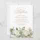 Elegante Peony Floral Script Taufe Einladung zeigt eine schöne Abbildung von weißen Pfannkuchen und Grün.