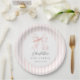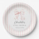 Elegant baby shower paper plates that features light pink & white stripes and a simple bow design