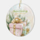 A Christmas ornament shows off a beautiful watercolor painting of an elegantly wrapped light pink holiday package. It has beautiful vintage gold ribbons, seasonal green pine accents and pine cones. A smaller mint green present is beside it. This is a lovely nostalgic image of Yuletide presents for those special people on your list.