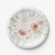 Die Teller aus Papier zeigen ein elegantes, Bohemisches Blumendesign mit rosa und elfenbeinfarbenen Rose und Blattwerk.