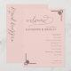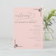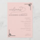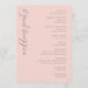 This wedding program features a minimalist and elegant design with a soft pink background, creating a warm and inviting atmosphere. The layout is clean and organized, with centered text in a mix of flowing script for the welcome message and a modern sans-serif font for the ceremony schedule. Decorative geometric shapes add a contemporary touch to the understated aesthetic, making it perfect for a sophisticated event. The overall style emphasizes clarity and refinement, ideal for couples seeking a chic and functional program for their special day.