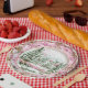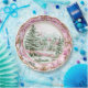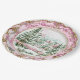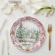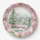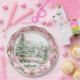 This elegant plate design features a decorative faux gold and pink border design with a pink and green winter scene.