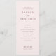 This wedding program features a minimalist and modern design with a soft pink background, creating an elegant and inviting atmosphere. The layout is clean and structured, utilizing ample negative space to highlight the hierarchy of text in muted pinks and deep maroons. Typography plays a key role, with serif fonts adding sophistication and cursive for a romantic touch, while customizable placeholders allow personalization for names, dates, and locations. Ideal for couples seeking a stylish yet straightforward program that emphasizes clarity and formality.