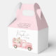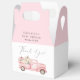 Elegante Gefälligkeitsboxen für Ihre kleine Mädchendusche mit Aquarellfarben eines rosa Vintagen Lastwagens mit Kürbis und Blumen und "Danke" und "Ein süßer Kürbis ist auf dem Weg" in moderner grauer Typografie und einem stilvollen Drehbuch mit Herzschlag.
