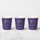 Elegant purple paper cups for your 50th birthday party featuring "50 & Fabulous" in a chic white calligraphy script and your name in simple white lettering.
