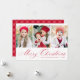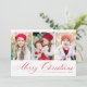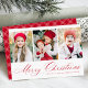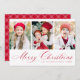 Einfache Weihnachtskarte mit drei senkrechten Fotos mit "Frohe Weihnachten" in einem festlichen roten Kalligrafieschrift. Personalisieren Sie die Vorderseite der Multi-Foto Weihnachtskarte mit Ihrem Familiennamen und dem Jahr. Die Karte zeigt ein modernes kariertes Farbmuster an.