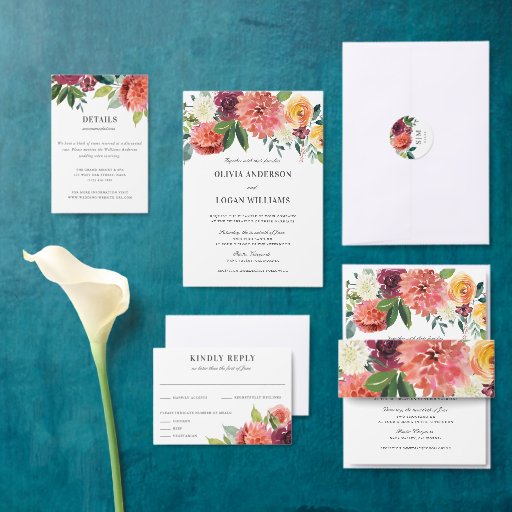 This design features a beautiful watercolor dahlia bouquet. It's a rustic yet elegant wedding invitation that would be perfect for a romantic wedding any time of the year. See the collection for coordinating items from this wedding invitation suite...