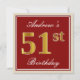 Dieses schlichte und elegante Geburtstagsgeschenk-Design enthält eine personalisierte Botschaft wie "Andrews 51. Geburtstag" (mit dem "51." mit einem Imitat/Imitation in goldenem Aussehen) in einem rot-farbenen quadratischen Bereich mit einer schlichten Kontur. Der Name ist in einem Text in weißer Schrift und kann personalisiert sein. Die Rückseite bietet individuell anpassbare Einladungsdetails. Eine solche Geburtstagsfeiereinladung könnte vielleicht genutzt werden, um Leute zu einer Geburtstagsparty einzuladen, die für jemanden veranstaltet wird, der seinen 51. Geburtstag feiert. [~Z0000227]