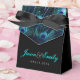 Schöne königsblaue Pfauenschachteln Gastgeschenk Hochzeit. Sie können diese elegante königliche und aquamarine blaue Pfauenschachtel mit Ihrem Schriftart-Stil personalisieren, eine Hintergrundfarbe hinzufügen und die Farbbandfarbe ändern.