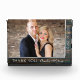 Elegantes rustikales Holzskript Danke Gastgeschenk Hochzeit Foto Block. Ein bevorzugter Hochzeitsblock mit einem Hochzeitsfest-Foto, Bräunungs- und Bräutigam-Namen und einem Hochzeitsdatum. Der Hintergrund ist rustikal dunkle Holzstruktur. Ein elegantes und stilvolles Dankeschön-Foto - großartig als Geschenk für Ihre Gäste. Vielen Dank, Text ist in einem modernen Skript. Fügen Sie Ihr Lieblings-Hochzeitsgeschenk-Foto in die Vorlage und machen Sie ein persönliches Geschenk.