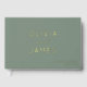 This elegant wedding guest book features a minimalist design with a muted sage green cover and gold accents, creating a sophisticated and modern aesthetic. The layout is clean and balanced, showcasing the names "OLIVIA and JAMES" in an eye-catching script font that adds a personal touch. Gold stars and confetti scattered around enhance the celebratory mood, making it perfect for formal occasions. The understated style conveys refinement and exclusivity, ideal for capturing cherished memories at your special event.