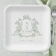 Classic sage green floral crest wedding paper plate with monograms, perfect for a modern classic or romantic vintage wedding. For more advanced customization of this design, please click the BLUE DESIGN TOOL BUTTON above! Matching items are also available.
