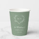 Mit unseren eleganten Monogramm-Papiertassen schaffen Sie den perfekten Empfang. Das Design umfasst einen botanischen Kranz, der die Monogramm-Initialen der Braut und des Bräutigams auf einem halbgrünen Hintergrund umkreist. Personalisieren Sie Design mit den Initialen der Braut und Bräutigam, Namen und Datum. Design wiederholt sich auf der Rückseite.