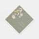 Elegant Sage Green Wildflower Bouquet Wedding Napkins. This napkin has a soft, elegant style with a muted green background that feels calming and timeless. The classic serif font with the organic wildflowers give the design a formal but whimsical quality. Delicate floral illustrations along the left side add a touch of nature-inspired charm. The layout is clean and organized, using a right alignment and clear spacing to create a refined look. Overall, the design feels romantic yet understated, perfect for a modern or a rustic wedding.