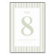 This wedding table card features a minimalist and elegant design with alternating light green and white vertical stripes framing the central content. The focal point is a large, stylized number "8" in muted sage green, resembling an infinity symbol, set against an off-white background for a clean contrast. Delicate script-like typography above the number adds a touch of personalization, while simple sans-serif fonts below provide clear space for custom names and dates. The overall style exudes calmness and sophistication, perfect for formal occasions like weddings, where understated luxury and grace are celebrated.