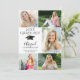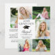 Mit dieser eleganten Ankündigung des Fotos mit 6 Fotos (5 vorne und 1 hinten), einem schwarzen Graduiertendeckel oder einer Mortarboard, dem Titel JEAR GRADUATE mit dem Namen Ihres Absolventen in einem trendigen handgeschriebenen Drehbuch und dem schwarzen Schulnamen vor einem weißen Hintergrund, kündigen Sie den Abschluss Ihres Absolventen an. Der Rücken ist so konzipiert, dass er nach Wunsch Informationen über Ihre Absolventen, Aktivitäten und Zukunftspläne enthält. HILFE: Für Hilfe bei der Modifikation/Personalisierung des Designs, bei Farbänderungen, bei der Übertragung des Designs auf ein anderes Produkt oder wenn Sie die Dinge koordinieren möchten, wenden Sie sich bitte an den Designer, BEVOR Sie über Zazzle Chat oder makeitaboutyoustore@gmail.com bestellen.
