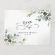 Diese individuell gestaltbare UAwg Postcard ist für die Abstimmung mit unserer Hochzeitskollektion Boho Greenery konzipiert und verfügt über eine üppige Aquarellgrüne Eukalyptus-Blätter mit Set vor einem zarten Aquarellwaschhintergrund mit kalligrafischem Text, gepaart mit einer klassischen Serif und modernem Sans-Schriftart in Schwarz. Matching-Elemente verfügbar.