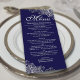 Dieses schöne Menü wird Ihrem Hochzeitsempfang etwas mehr Stil verleihen. Es zeichnet sich durch ein wunderschönes Design aus, mit verzierten silbergrauen Imitaten und Wirbel auf marineblau-blauem Hintergrund. Es gibt Platz für die Namen des Paares und das Hochzeitstag, und der Text ist vollständig anpassbar. Elegant, elegant und glänzend, wird dieses Menü Ihrem Fest eine Atmosphäre der Eleganz und Anmut verleihen.
