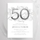 Elegant silberweiß 50. Geburtstagsfeier Einladung. Individuell anpassbares modernes feminines Design mit Rose botanischen Akzenten und Imitaten Glitzer Silber. Einfache florale Einladungskarte perfekt für eine stilvolle Damenfeier. Personalisieren Sie Ihre persönlichen Daten. Gedruckte Zazzle Einladungen oder Sofortdownload digitalen druckbaren Vorlage.