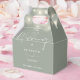 This elegant sage green wedding favor box, featuring pretty string lights, can be personalized with your information in chic typography. Designed by Thisisnotme©