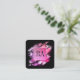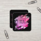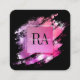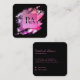 Berufliche schicke, luxuriöse Visitenkarte mit glamourösem ombre rosa lila geometrischer Quadrat enthält Monogramm-Initialen und die Prägung mit vollständigem Namen in der Mitte vor einem künstlerischen Pinselstrich mit schwarzem Hintergrund und Social Media-Konten mit Ikonen