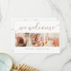 This minimalist and stylish design features three of your favorite photos in a square shape, with a ´´We Welcome´´ header in elegant calligraphy script above and baby´s name in simple modern typography below in delicate caramel color. The reverse features a ´´thank you´´ and a 4th photo. Your family and friends will cherish this baby shower thank you, and birth announcement card for years to come! To customize, click on the ´Personalize´ button.